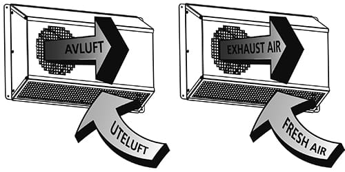 Zewnętrzna czerpnia ścienna służy do wprowadzenia świeżego powietrza od dołu przez kratkę przeciwpyłową. Zużyte powietrze jest transportowane poziomo za pomocą siatki na przedniej stronie dyfuzora. Taka konstrukcja zapobiega mieszaniu świeżego powietrza i powietrza wywiewanego. Z